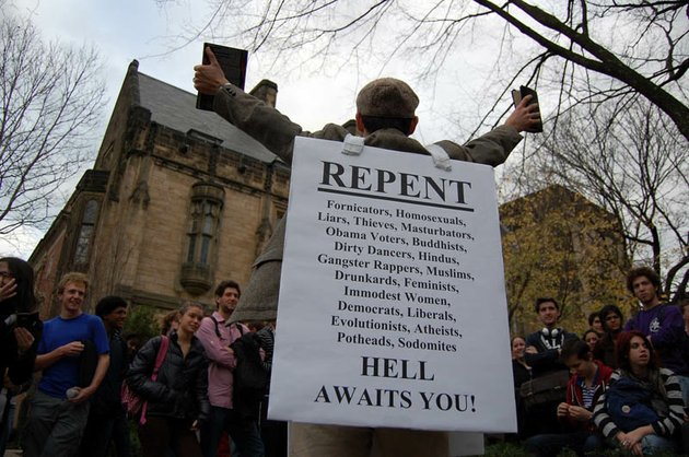 En diciembre de 2009 Jesse Morrell, un joven evangélico de 25 años protestó por tres dÃas en el campus de la Universidad de Yale con un cartel en el que decÃa que gays, hinduistas, los evolucionistas y muchos más irÃan al infierno: