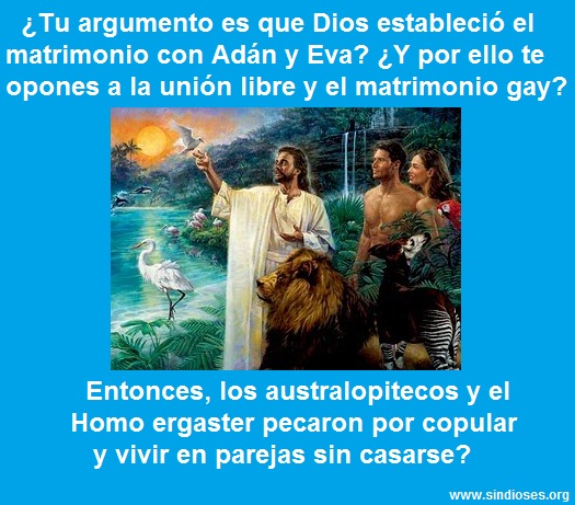Argumentar que el matrimonio es una institución establecida por Dios en el Edén es falso. Nunca hubo tal JardÃn del Edén, porque es parte de un mito mesopotámico, que luego pasó a los hebreos. Nunca hubo Adán y Eva. AsÃ, que si con un matrimonio homosexual no se perjudica a nadie, y por el contrario se otroga un marco legal de protección a una pareja ¿nos vamos a detener por un mito de la edad de bronce?