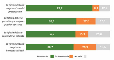 Los pronunciamientos acerca del tipo de cambios que la Iglesia deberÃa introducir contrastan categóricamente con las enseñanzas actuales de la jerarquÃa. El 79,2 por ciento (82,7 entre los católicos) está a favor del uso del preservativo, el 60,1 por ciento (58,7 entre los católicos) se inclina por el sacerdocio de la mujer, el 58,9 (54,9 entre los católicos) está en desacuerdo con el celibato y el 56,7 (59,7 entre los católicos) opina que la Iglesia deberÃa “aceptar la homosexualidadâ€. Datos todavÃa más contundentes que los obtenidos cinco años atrás por la investigación hecha por las universidades: 42 por ciento a favor del sacerdocio de la mujer y 58 de acuerdo con la posibilidad de que los curas formen familia.