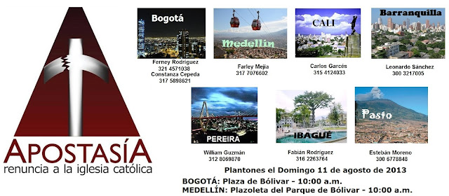 El dÃa 15 de agosto de 2013 se llevará a cabo la apostasÃa colectiva internacional en Puerto Rico, Colombia, Ecuador, Venezuela y Chile. Las personas interesadas en retirarse de los libros de la Iglesia Catolica deben allegar copia de sus partidas de bautizo, carta de apostasÃa y fotocopia de documento de identidad.