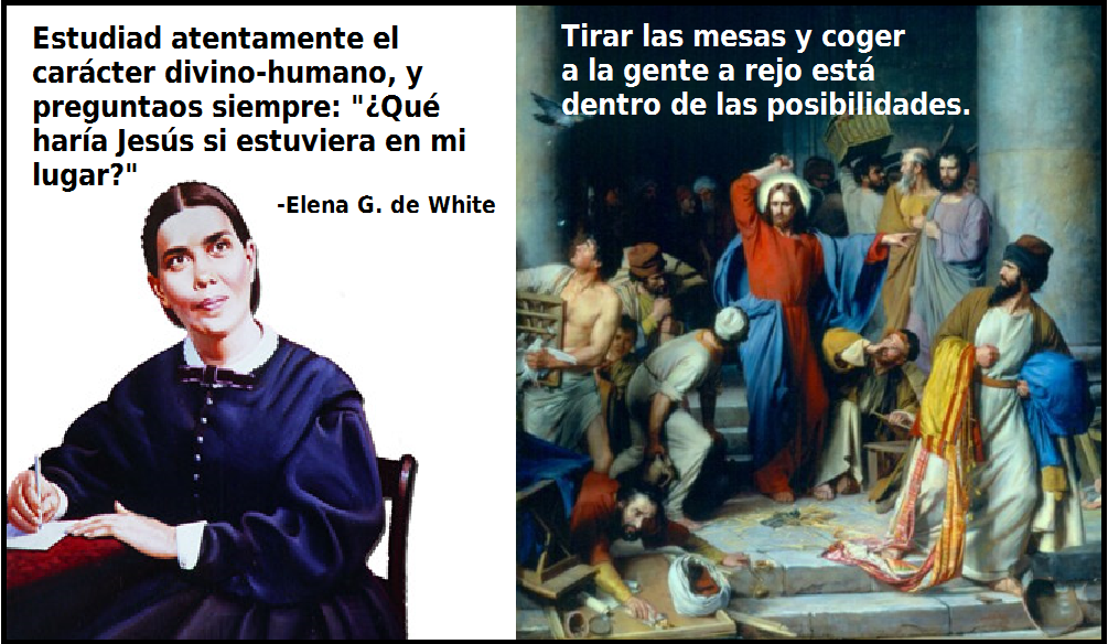Por ejemplo la confundadora del adventismo, la señora White recomienda: "Estudiad atentamente el carácter divino-humano, y preguntaos siempre: "¿Qué harÃa Jesús si estuviera en mi lugar?" Tal debiera ser la norma de vuestro deber... Moderad la impetuosidad natural de vuestro ser con mansedumbre y dulzura."