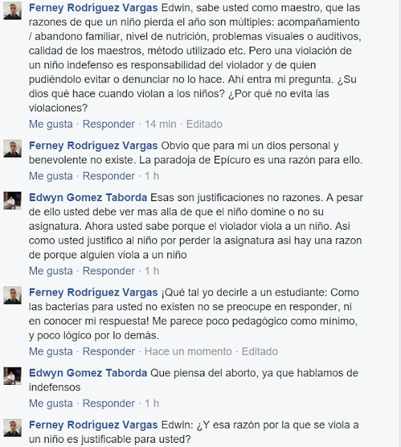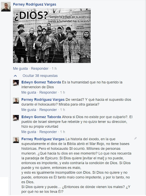 En un grupo de docentes en Facebook un maestro puso una imagen de proselitismo religioso a lo cual se le respondió con una imagen sobre los campos de concentración. La siguiente conversación muestra la reacción de un creyente frente a esta respuesta.