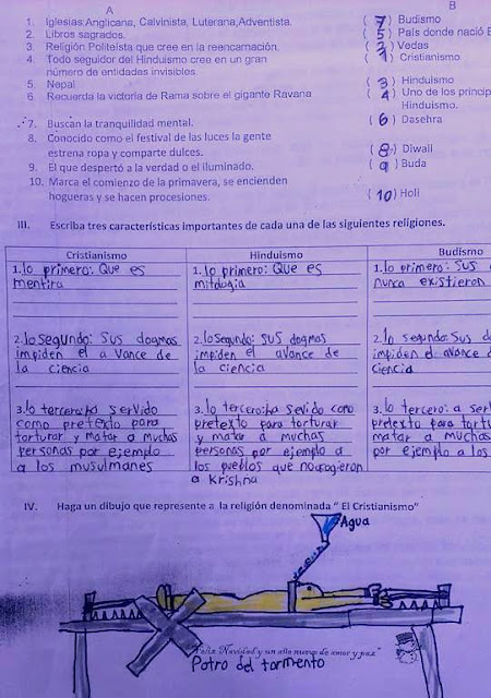 Llegó el fin del año escolar, que en Colombia se da por noviembre, y Cristian fue llamada a habilitar la asignatura. La habilitación es un examen de rescate que en caso de perderse da como resultado la perdida del año escolar.Sin embargo, para finales de año, el docente creacionista ya no orientaba la asignatura, y la responsabilidad cayó en una docente que empezó a presentar todas las religiones pidiendo identificar sus sÃmbolos, libros sagrados, fundadores y demás. Era la primera vez que los estudiantes escuchaban de otras religiones, o por lo menos para no escuchar que eran falsas comparadas con el catolicismo.