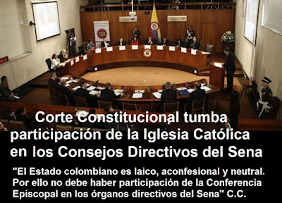 La Sala Plena de la Corte Constitucional tumbó la norma establecida en la ley 119 de 1994 que permitÃa la designación de un miembros de la Conferencia Episcopal de Colombia en el Consejo Directivo y en los Consejos Regionales del Servicio Nacional de Aprendizaje (Sena) para su representación.