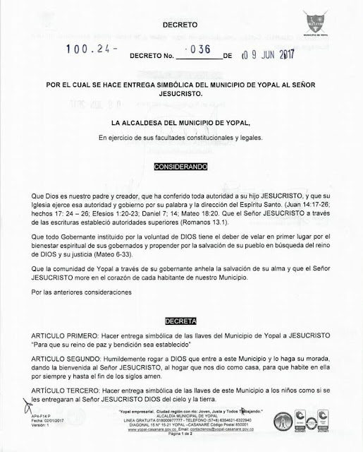 - Luz Marina Cardozo, alcaldesa evangélica de Yopal, Casanare, entregando por decreto ese municipio colombiano a Jesucristo.