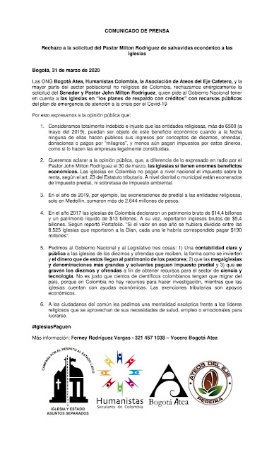 En un comunicado de prensa emitido por ONG ateas yhumanistas seculares, se ha hecho eco de esta indignación ciudadana frente a lapropuesta del Pastor John Milton RodrÃguez y piden Gobierno Nacional y al Legislativo tres cosas: “1) Una contabilidad clara y pública a las iglesias de los diezmos y ofrendas que reciben, la forma como se invierten y el dinero que de estos llegan al patrimonio de los pastores; 2) que las megaiglesias y denominaciones más grandes y solventes paguen impuesto predial y 3) que se graven los diezmos y ofrendas a fin de obtener recursos para el sector de ciencia y tecnologÃa.â€
