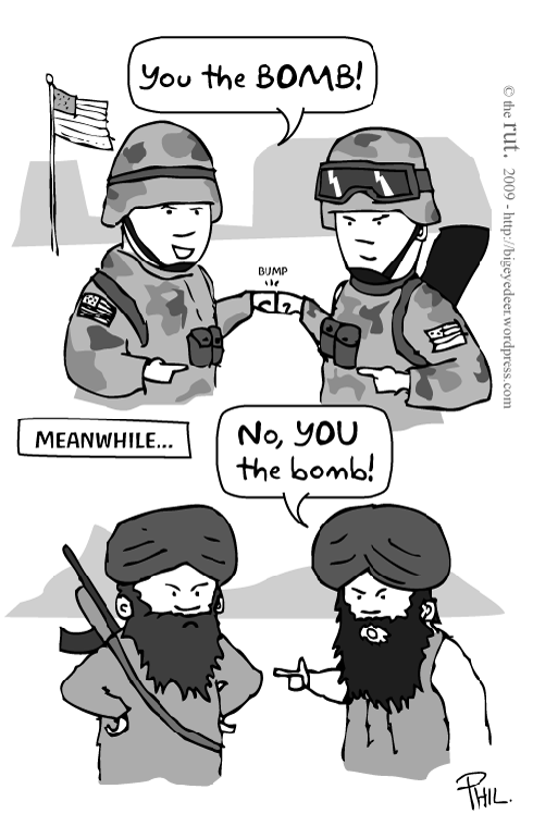 Ciertamente, que se lo digan dos soldados occidentales o dos extremistas islámicos no es exactamente lo mismo. Viñeta de Phil.