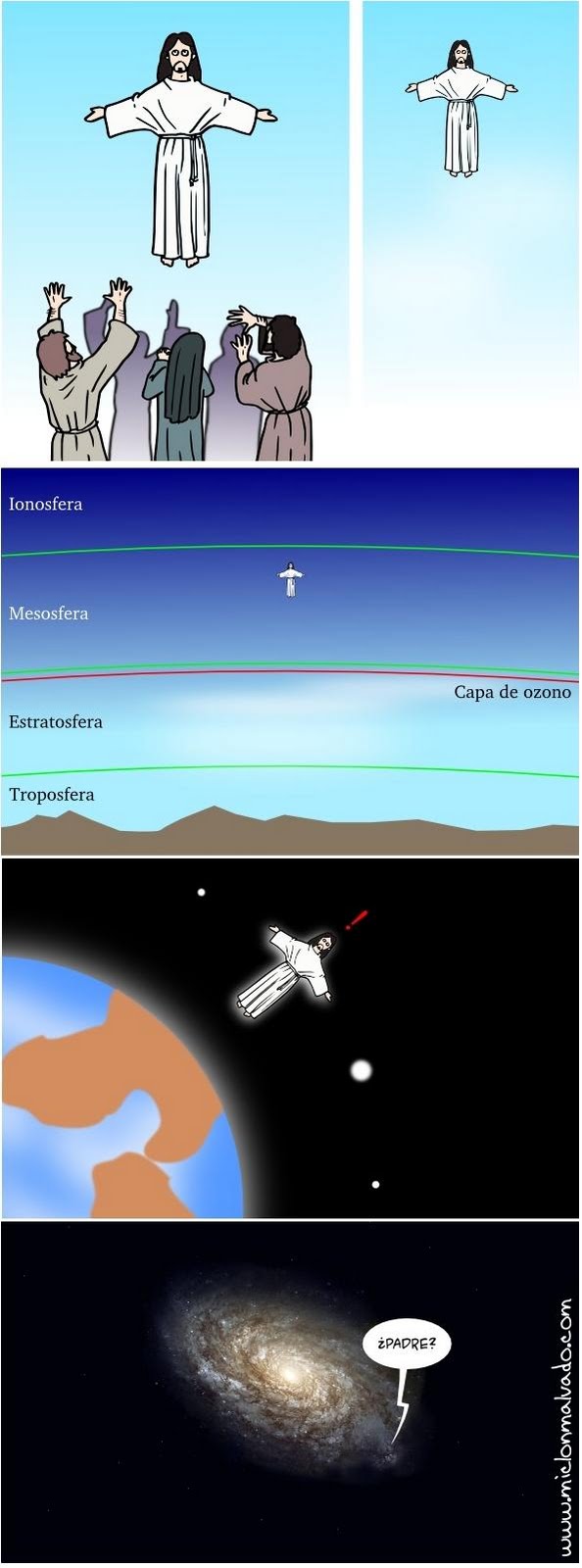 Después de la improbable resurrección vino la muy improbabale ascención (hagan los cálculos de las probabilidades de ambos eventos y multipliquénlos).Esta viñeta aparecida en el blog Tierra Sucia nos pregunta a dónde ascendió Jesús.