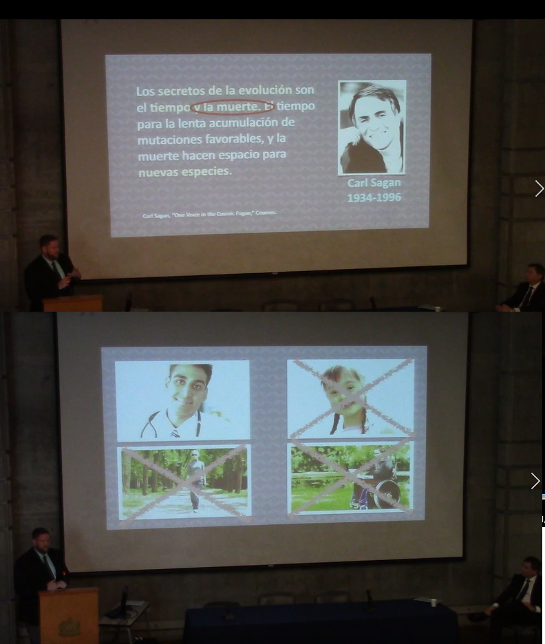 En otro lamentable momento hubo citas de Sagan y Neil deGrase Tayson sacadas de contexto. En una de ellas fue del primero, en el que hablando de la selección natural mencionaba la muerte de los organismos como parte del proceso natural (piense en unas bacterias que perecen por la acción de la amoxicilina). El pastor Owen sacó de contexto la cita para decir que la muerte de los niños con SÃndrome de Down, ancianos y personas con discapacidad era lo que se esperarÃa que pidieran quienes siguen una postura naturalista. Para terminar un bombardeo de versÃculos bÃblicos (ver imagen inicial) para terminar con la salvación de Jesús.