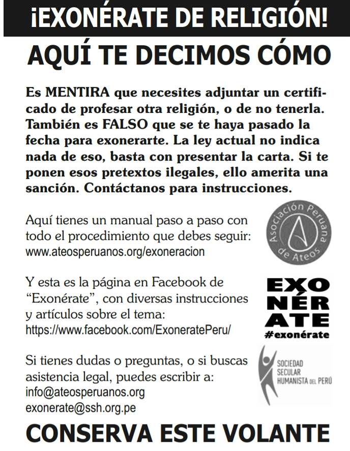 La Asociación Peruana de Ateos (APERAT) y la Sociedad Secular y Humanista de Perú (SSH) han iniciado una campaña informativa para que los estudiantes de colegios públicos, universidades y hasta colegios privados, puedan exonerarse de tomar la clase de religión.