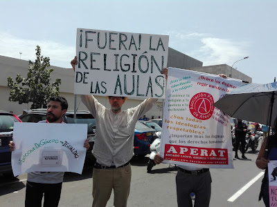 | "Fuera la religión de las aulas" cartel de Iván Antezana. |