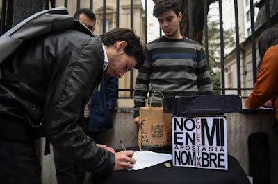 | La campaña latinoamericana de apostasÃa tiene por lemas: "No en mi nombre" y "ApostasÃa es Libertad" #ApostasiaEsLibertad |