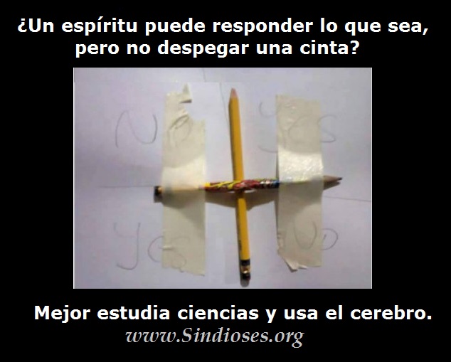 ¿Puede un espÃritu poner objetos en movimiento? ¿Y que tal si levantase la cinta para poder mover el lápiz? ¿O porque no mejor levantar el lápiz y escribir la respuesta? Asà no habrÃa lugar a dudas. Pero no. Los espÃritus son escurridizos, no se presentan ante ateos, responden con golpecitos tontos, n lugar de respuestas concretas. Responden cosas fáciles o cotidianas. Nada de responder con la cura para el cáncer de páncreas o el número de la loterÃa de la siguiente semana. Y si presuntamente lo hacen, no dejan testigos o evidencias.