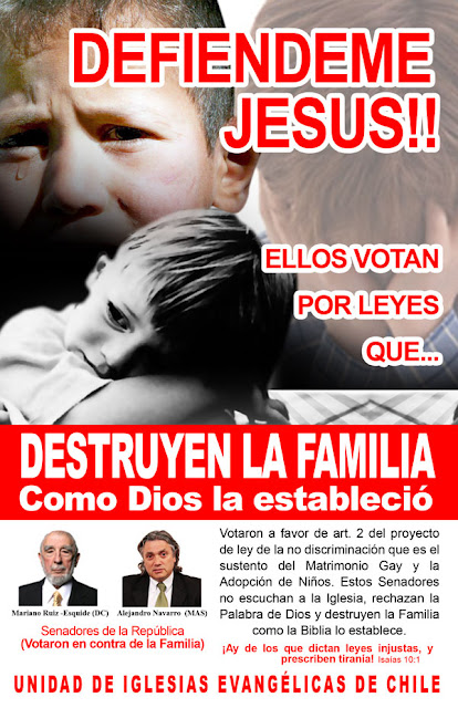 La Unidad de Iglesias Evangélicas de Chile, la Red de Pastores por la Vida y la Familia, y de la Federación de Entidades Religiosas de Chile, han elaborado un cartel en protesta por la aprobación de la Ley antidiscriminación que protege a gays y lesbianas de actos discriminatorios.