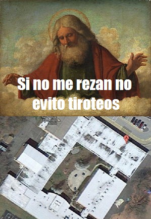 ¿Saben? Cuando estaba en la escuela elemental orabamos en las escuelas y no necesitábamos armas. Lo voy a repetir: En la época en que teníamos rezos, Biblia y los diez mandamientos no necesitábamos armas. Así que voy a sugerirles como solución definitiva, que el problema no es la segunda enmienda, sino la primera que garantiza el libre ejercicio de la religión.