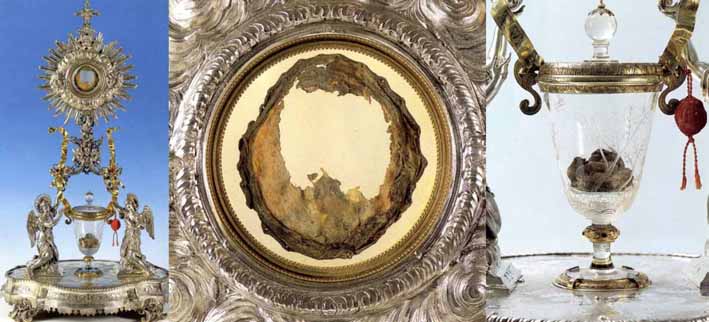 Se dice que allá por el año 700, hace unos 1300 años nada menos, un sacerdote estaba atormentado por las dudas que le suscitaba el asunto de la conversión del pan y el vino en la carne y sangre de Jesús. El rezaba constantemente para liberarse de este dilema por miedo a perder su vocación. Una mañana le vinieron estas dudas con especial fuerza, precisamente cuando se disponía a consagrar el pan y el vino durante la misa, en ese mismo momento se produjo el supuesto milagro y observó con emoción como el pan se había convertido en una loncha de carne conservando la forma y tamaño de la hostia original y el cáliz aparecía lleno de auténtica sangre. Se volvió entonces a sus feligreses y les comunicó el milagro invitándoles a observar aquella maravilla y agradecer al Señor el privilegio de ver la auténtica carne y la auténtica sangre de Jesucristo. La loncha de carne se sujetó a una tabla de madera con unos alfileres para evitar que se enrollase una vez seca y los cinco coágulos que se formaron a partir de la sangre del cáliz fueron depositados en una copa de vidrio. Finalmente ambas piezas fueron montadas en un relicario (imagen superior) para que los fieles de todo el mundo pudiesen peregrinar a Lanciano y comprobar por ellos mismos el milagro que había tenido lugar.