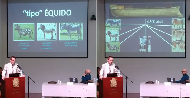Si bien Jeanson afirmó en la conferencia, que su libro no mencionaba la Biblia por ninguna parte, saltó de proponer una especie ancestral para los équidos (que serÃa creada por Dios), para proponer que esa fue la especie o tipo que se salvó del diluvio. Es asà como en su diapositiva aparece un Arca de Noé con la fecha de 4500 años, fecha del supuesto diluvio universal y radiando las especies de équidos actuales desde allÃ.