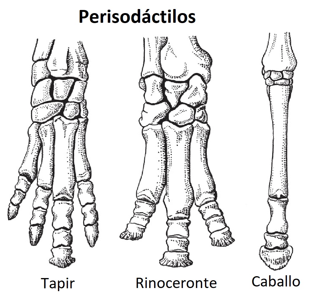 Este grupo, se caracteriza por tener en sus patas una condición mesaxónica, lo que quiere decir que el eje de la extremidad pasa por el dedo medio, que forma el soporte. La anatomÃa ósea de las extremidades muestra una disposición muy particular, tales como que el hueso astrágalo muestra una superificie proximal en forma de polea, mientras que su superficie articular distal es prácticamente plana. El calcáneo no articula con la fÃbula. Además, los perisodáctilos carecen de clavÃcula y su fémur muestra un tercer trocánter muy desarrollado. La ulna (cúbito) y la fÃbula (peroné) se encuentran reducidos y carecen de movimiento. Estas caracterÃsticas permite diferenciar a los perisodáctilos y fueron señaladas en 1848 por el anatomista y paleontólogo inglés Richard Owen.