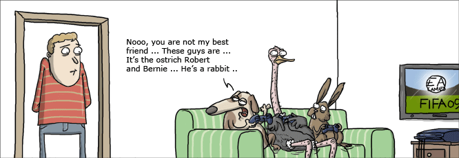 «No, tú no eres mi mejor amigo, son ellos, te presento al avestruz Robert y a Bernie. Es un conejo.»
