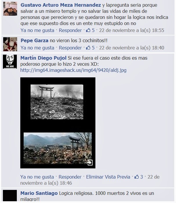 Una vez conocida las respuestas de los creyentes muchos ateos y agnósticos hicieron las preguntas lógicas ¿Esté es la mejor manera que tiene su dios para manifestarse?, ¿No se deberÃa a que la iglesia estaba hecha de concreto?, ¿Qué moral tiene su dios para mandar una señal por medio de esta destrucción?