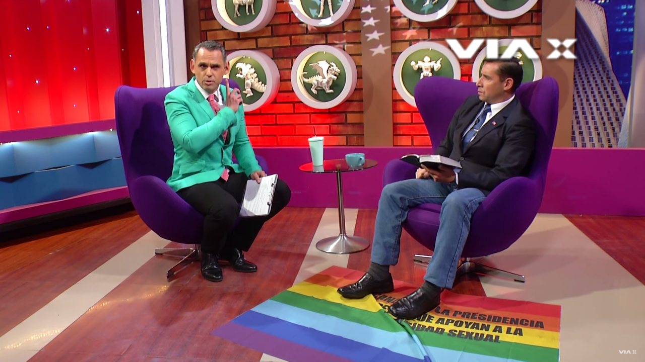 "Antes de avanzar quiero recordar, tengo un poco de frÃo en los pies para lo cual traje una alfombra (saca una bandera LGBT y la pone en el piso) que yo uso siempre en los programas a los que yo voy. Este es el trapo de inmundicia (mientras la pisa) para hacer más ameno el programa. "