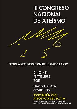 Con el lema "Por la recuperación del estado laico" se llevara a cabo este fin de semana el tercer Congreso Nacional de AteÃsmo en Mar del Plata, Argentina.Los miembros de la Asociación Civil Ateos Mar del Plata han convocado a su congreso anual, para reflexionar sobre la importancia del laicismo en Argentina y el mundo.