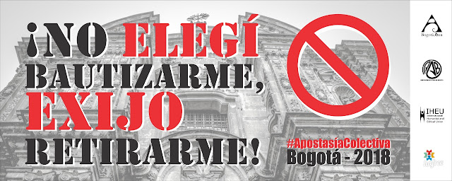 Bajo el lema "No elegà bautizarme, exijo retirarme las ONG Bogotá Atea, La Asociación de Ateos de Bogotá, Hispanic American Freethinkers, y IHAEU (International humanist and Ethical Union) están invitando a una jornada de apostasÃa en la capital colombiana. Como apostasÃa se conoce al acto de renuncia pública de la fe religiosa y su mera solicitud deberÃa, según el Código Canónico, ser motivo de expulsión.