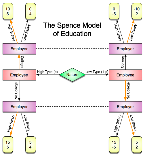 Spence introduce el concepto de "señalización" en el contexto de la educación. En la versión más sencilla de este modelo se estudia un mercado entre empleadores y varios candidatos a empleado. Las caracterÃsticas del empleador son conocidas por todos, pero las del candidato solo son conocidas por él mismo. En particular, el candidato puede tener una alta o baja habilidad para realizar el trabajo requerido por el empleador. Sin más especificaciones y puesto que la habilidad no es observable, el empleador sólo estará dispuesto a ofrecer un salario que refleje la calidad media esperada de los candidatos.