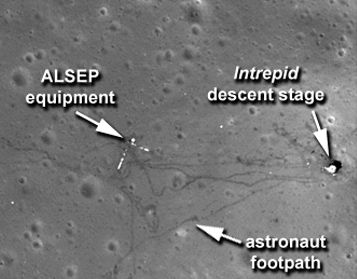 Las cámaras de la LRO pudieron fotografiar también los lugares del aterrizaje de los módulos lunares Apolo 12 y Apolo 14. En el lugar donde el Apolo 12 alunizó se ven las huellas de los astronautas, asà como unos cables que unen unos equipos cientÃficos experimentales con otros.
