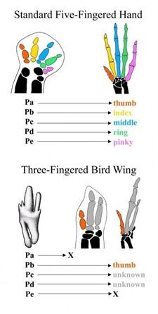 El primer dedo de las aves se desarrolla donde debería estar el dedo índice en una vértebra de cinco dedos.