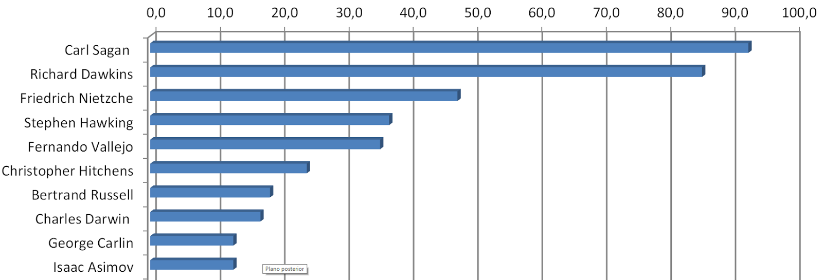 Autores con menor porcentaje fueron Bill Maher, Ayn Rand, Dan Barker, Matt Dillahunty, Mijail Bakunin, Andre Compte-Sponville, Emma Goldman, Earl Doherty, Sherwin Wine, Ramachandran,