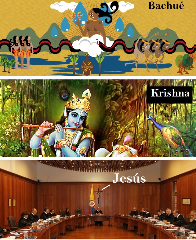 Curiosamente, otros grupos ciudadanos han planteado otra idea: ¡Qué se pongan otros sÃmbolos religiosos!. Un ciudadano hinduista peticionó que se le permitiese poner la imagen del dios Krishna al lado del crucifijo, y un ciudadano que se identifica como indÃgena muÃsca pidió que se le permita poner una imagen de la diosa Bachué junto al sÃmbolo católico. Un pastafari también solicitó la inclusión del dios Monesvol. Según este último "no es posible decir que Colombia es un Estado pluricultural y poner sólo un sÃmbolo religioso. O todos o ninguno".
