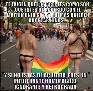 Este otro meme nos muestra a un par de hombres velludos y semidesnudos de espaldas mientras sostienen una bandera gay. El texto dice: "Te exigen que los aceptes como son, que estes de acuerdo con el matrimonio gay y además quieren adoptar niños... Y si no estás de acuerdo, eres un intolerante homofóbico, ignorante y retrógrada"