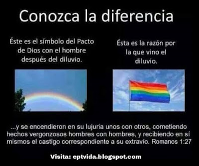 Un meme llamado "Conozca la diferencia" contenÃa un par de imágenes. en una de ellas un arco iris y otra una bandera LGBTI. Junto al arco iris un mensaje con el texto "Este es el sÃmbolo del Pacto de Dios con el hombre después del diluvio"