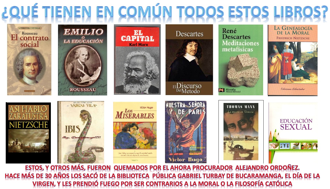 El caso de quema de libros más reciente lo encontramos el 13 de mayo de 1978, día de la fiesta de la Virgen de Fátima. En esa noche Alejandro Ordoñez Maldonado, actual embajador de Colombia en la OEA del Gobierno Duque, junto con varios miembros de la organización “Tradición, Familia y Propiedad” hicieron una hoguera en Bucaramanga, al mejor estilo de la Inquisición. Varios libros fueron sacados de una biblioteca pública y alimentaron las llamas obras de Descartes, Gabriel García Márquez, Rousseau, Freud, Marx, Thoman Mann, revistas y periódicos con fotografías de desnudos femeninos y hasta una Biblia, que juzgaron incorrecta por ser una “edición protestante”.