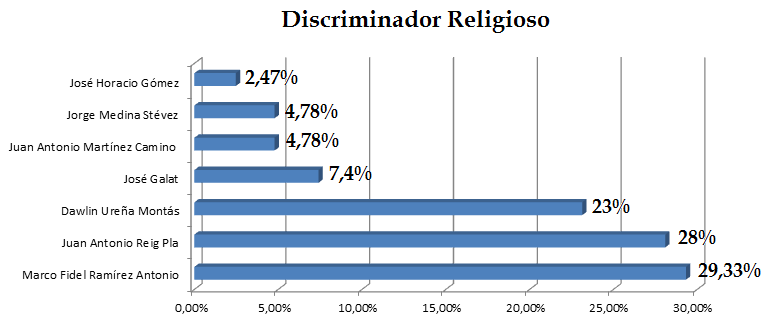 La categoría de discriminador religioso fue la más competida. La homofobia fue un "pecado" común a todos los candidatos a esta categoría. Juan Antonio Reig Plá de España estuvo a punto de ganar, pero por solo un punto porcentual el colombiano Marco Fidel Ramírez, concejal de Bogotá y pastor evangélico se llevó el galardón. Después de iniciada la votación algunos lectores propusieron a Justo Orozco de Costa Rica y al pastor chileno Carlos Martínez, pero debido a que las elecciones ya se habían iniciado no pudieron incluirse.
