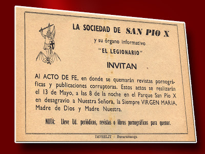 Como comentamos en una entrada anterior, el hoy Procurador General de la Nación en Colombia, Alejandro Ordoñez Maldonado, es un ultra católico (lefbvrista) que es cuestionado por anteponer sus convicciones personales en su cargo público. En su juventud realizó una quema de libros de filosofía, literatura y educación sexual. Tal como lo narra la revista Semana: