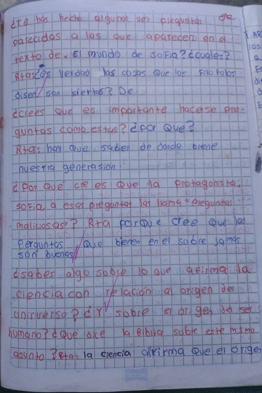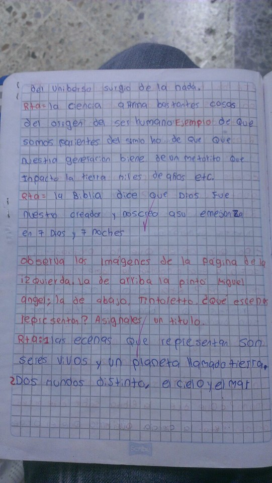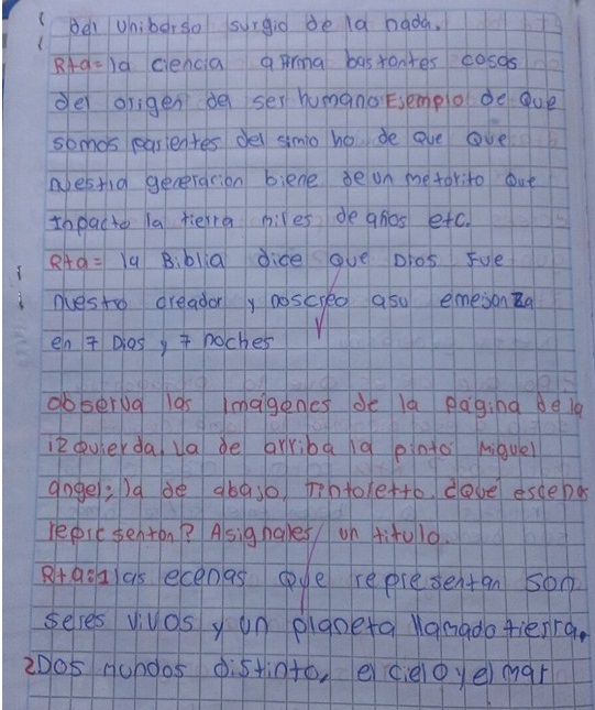 | Cuaderno de estudiante de grado sexto del Colegio Público Dámaso Zapata. Nótese como el profesor busca que los estudiantes acepten el creacionismo. |