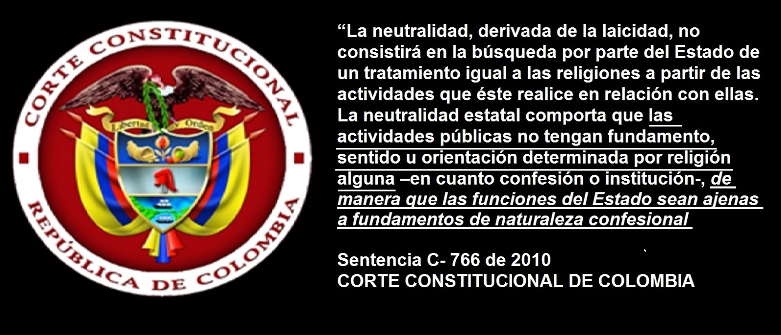 “La neutralidad estatal comporta que las actividades públicas no tengan fundamento, sentido u orientación determinada por religión alguna –en cuanto confesión o institución-, de manera que las funciones del Estado sean ajenas a fundamentos de naturaleza confesional. En este sentido, la igualdad no se logra motivando las funciones estatales con base en intereses de todas las religiones por igual –algo, por demás, de imposible realización en la práctica-, pues esta pretendida igualdad, en cuanto vincula motivos religiosos en las actividades estatales, serÃa diametralmente contraria al principio de secularidad que resulta ser el núcleo del concepto de laicidad estatal y, de su concreción, el principio de neutralidadâ€.