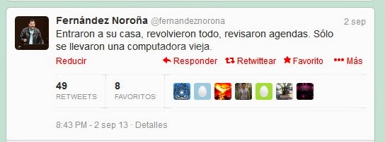 El dÃa 2/09/2013 el ex diputado Gerardo Fernández Noroña escribÃa en twitter que habÃan entrado a la casa de su hija de la cual lo único que se llevaron fue una computadora vieja y un retrato dónde aparece junto a su esposa e hija, ante lo cual se genero la pregunta de porque dejar las joyas y llevarse la computadora y un retrato de su familia. ¿Será por la defensa que está haciendo por la defensa de Pemex?