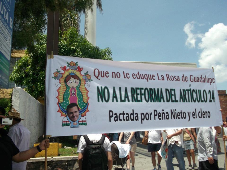 Acompañada de Marco Soto Rodríguez, también vocal del FCML, dijo que la reforma al artículo 24, aprobada por el Senado de la República el pasado 28 de marzo, es fruto de una negociación entre los legisladores Partido Revolucionario Institucional (PRI) y los jerarcas católicos, para que éstos ganen poder a cambio del apoyo absoluto al candidato presidencial Enrique Peña Nieto.