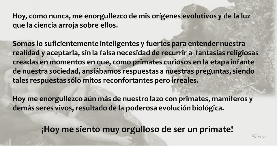 2. Nos sentimos orgullosos de "descender de un simio". No de una especie de simio actual, sino de un simio extinto, pero simio al fin y al cabo. No nos avergüenza nuestro origen evolutivo.