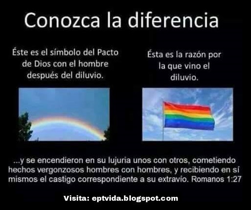 Un meme llamado "Conozca la diferencia" contenía un par de imágenes. en una de ellas un arco iris y otra una bandera LGBTI. Junto al arco iris un mensaje con el texto "Este es el símbolo del Pacto de Dios con el hombre después del diluvio"