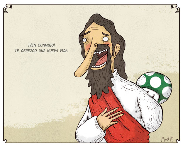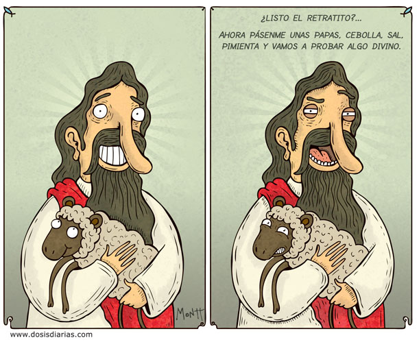 Una viñeta de Alberto Montt de su blog Dosis diarias. La imagen, de la derecha ya famosa en los medios de comunicación es resultado de la restauración fallida de la pintura de un Ecce Homo por la señora de Borja (Zaragoza, noreste de España).