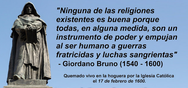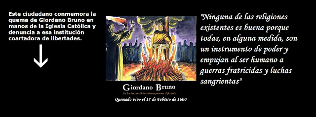 Este 17 de febrero se conmemora la muerte del pensador Giordano Bruno en manos de la Iglesia Católica. Para recordar este vil acto de intolerancia y fanatismo hemos diseñado esta imagen para todos aquellos que deseen ponerla en su cuenta de Facebook por este fin de semana.