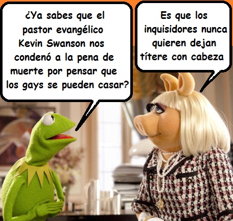 Como respuesta la reacción pro-gay de los Muppets, el pastor Kevin Swanson afirmó en un programa de radio que la rana y Peggy seguÃan "la senda de la sodomÃa", y anteriormente ya habÃa declarado que para él, todos los que están de acuerdo con el matrimonio homosexual deberÃan sufrir la pena de muerte. Swanson dijo, entre otras cosas: “Una perspectiva cristiana dio la pena de muerte a la homosexualidad entre los años 350 antes de cristo y 1850, aproximadamente. Por unos 1.500 años esa forma de vida habÃa sido prácticamente eliminada excepto por algunos casos aquà y allá; estaba en el clóset, pero casi no se supo de ello por más de mil años, hasta hace poco. Por supuesto, ahora existe un incremento masivo, masivo de este tipo de cosaâ€.Viernes, 25 de Mayo de 2012