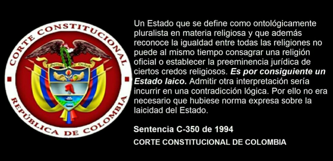 A todos ellos les digo que Colombia Si es un Estado Laico. Si bien no hay un artÃculo en la constitución que lo consagre expresamente, como ocurre en la Constitución de Ecuador, Honduras o Uruguay, la Corte Constitucional, único órgano encargado de interpretar la Constitución, asà lo declaró en la Sentencia C 350 de 1994, en la que justo se analizaba el caso de la consagración de Colombia al sagrado corazón de Jesús:
