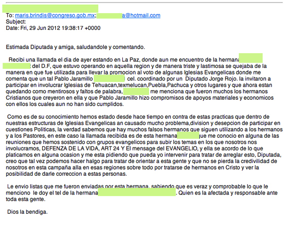 Sin Embargo cuenta con el intercambio de correos electrónicos (se adjuntan bajo este texto) que dan cuenta de cómo una líder evangélica que operó en el Distrito Federal admitió haber entregado a mil 800 “promovidos” (evangélicos que aceptaban que votarían por el candidato priísta) en Puebla e Hidalgo, pero al no recibir el material, decidió denunciar su historia. En los correos, la dirigente narra la promesa de que el día de la elección, mediante una movilización para ir a las casillas, los materiales serían entregados a sus “promovidos”.