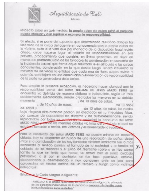 “(L)a conducta del señor Mazo Pérez no puede mirarse de manera aislada”, le dijo al juez 22 penal la Arquidiócesis de Cali “Hoy su despacho debe mirar si la participación de las hoy llamadas víctimas indirectas (padres, abuelas y tío) fue la más coherente al sentido común (…) y el juicio de reproche sobre si se hizo como familia lo que se tenía que hacer. ¿Se actuó con el sumo cuidado preventivo? O, por el contrario,“¿se fue laxo, permisivo, omisivo, abandonado y desinteresado y hoy concurren ante un juez para aprovechar un hecho dañino de un tercero y fungir como víctimas indirectas?”.