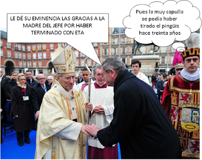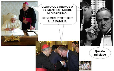 Por cierto, que este asunto me recuerda el famoso chiste del marido que le dice a la mujer: "Acabo de hacer algo importante en defensa de nuestra familia". "¿El qué?", pregunta la mujer, "¿has dejado el alcohol, vas a dejar de pegarme, vas a dejar de ir con fulanas, vas a permanecer más de una semana en un trabajo, vas a colaborar en las tareas domésticas, vas a estar más tiempo con los niños?". "¡Qué va!", responde el marido, "mucho mejor que eso: he firmado un panfleto de la parroquia en contra del matrimonio homosexual!".